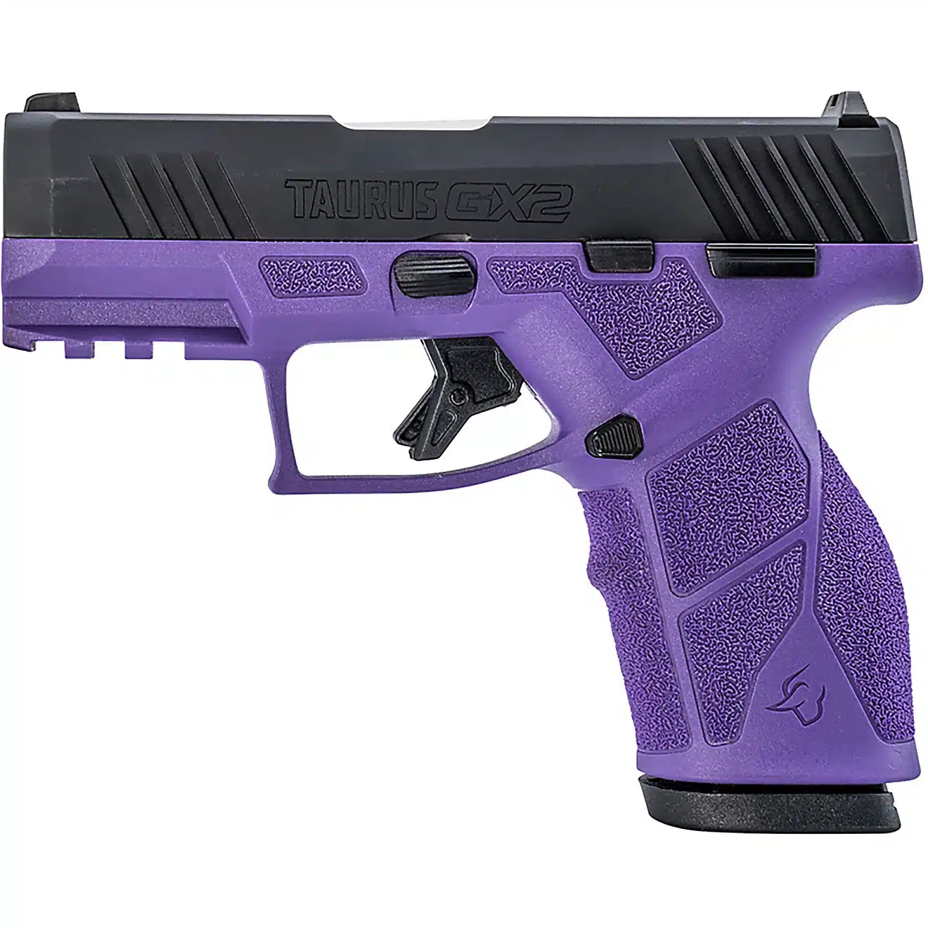 Arm yourself with the Taurus GX2 9mm Semiautomatic Pistol. It is single action with a 13-round magazine. The barrel with a black finish is 3.38-inches long, and it is equipped with a manual safety. The dark purple polymer grip finishes off the design.